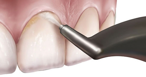 Лікар направляє спеціальний наконечник апарата на зуби, подаючи струмінь води, повітря та порошку під тиском.